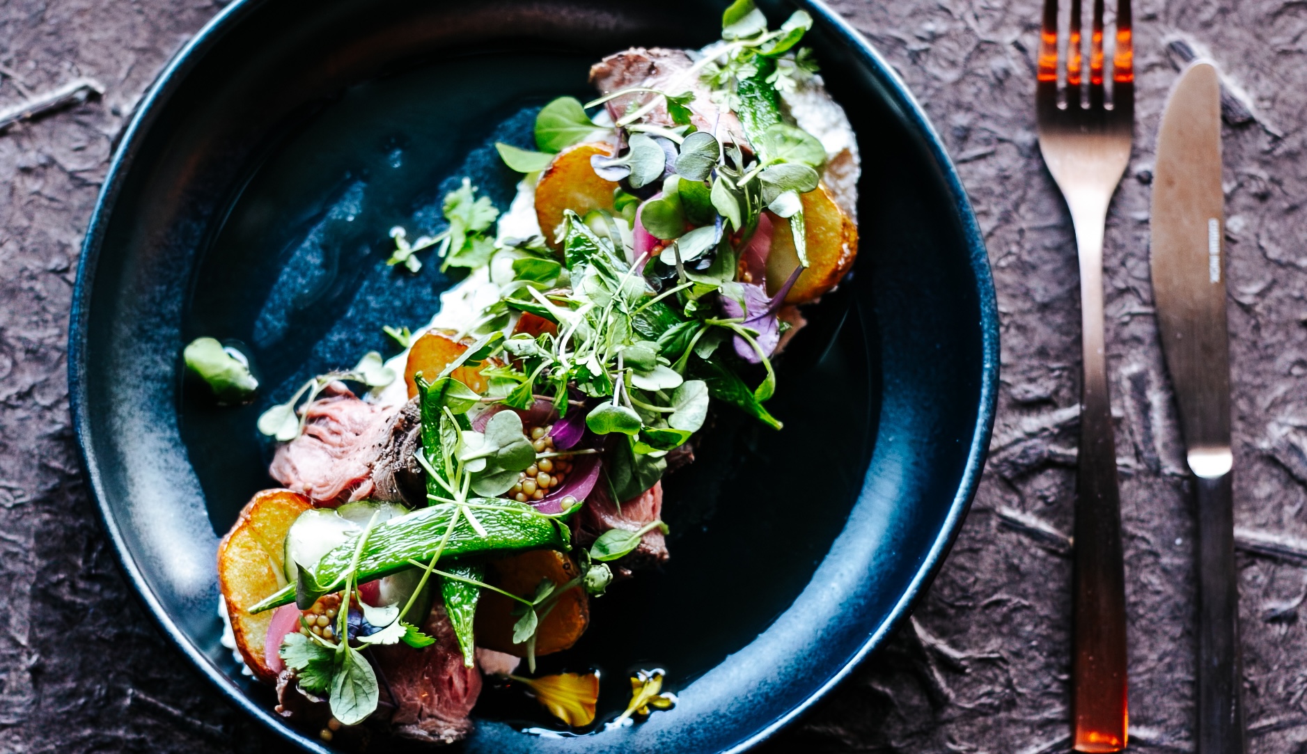 Piprakoorikus rostbiif, röstitud kartulid, marineeritud sibul, kurgiäkis, suhkruherned, mädarõikavaht, suitsutatud aioli